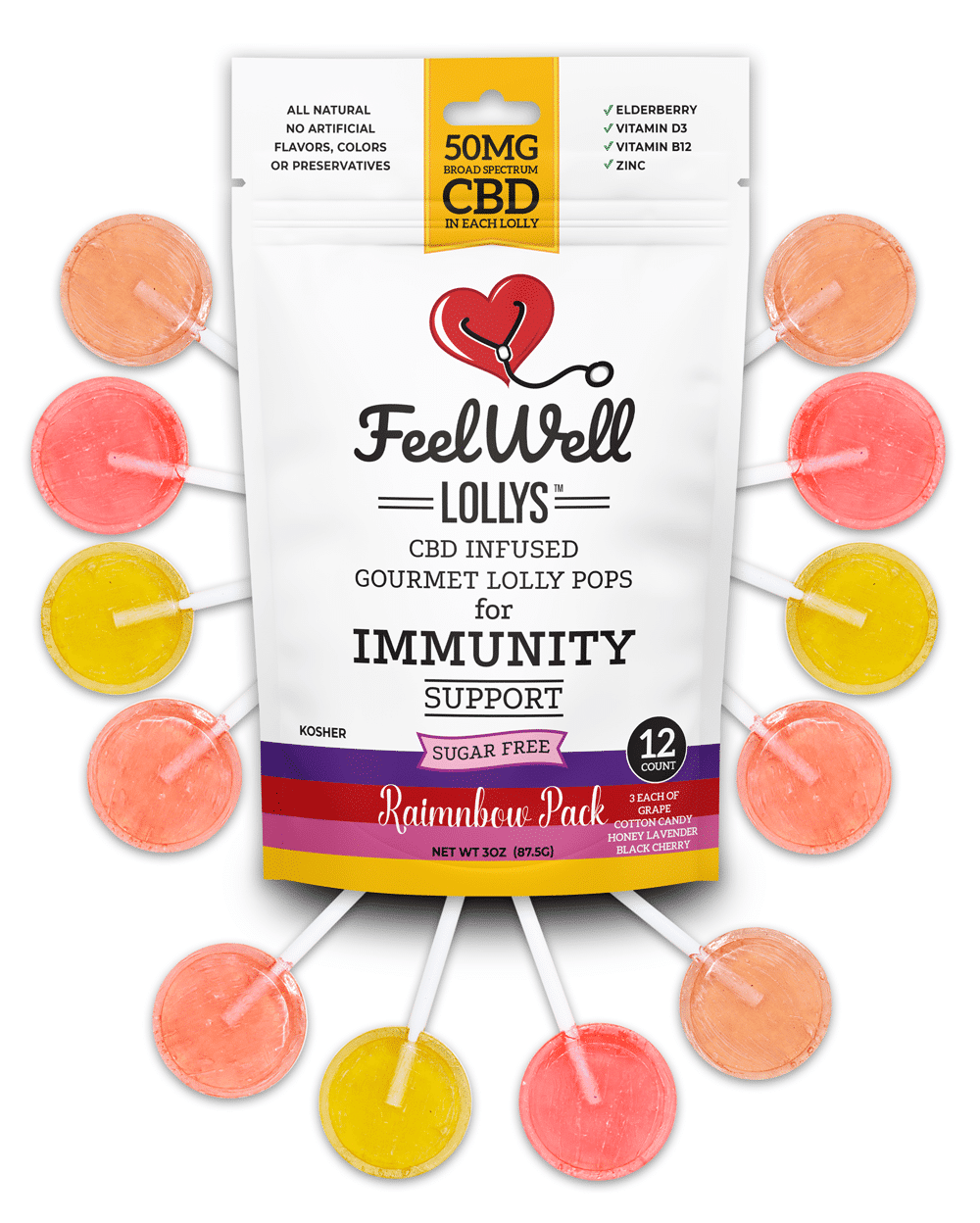 Everyone one loves lollys and everyone likes to feel great! So we developed a low calorie treat that delivers a powerful 50mg of hemp derived CBD plus popular immune boosters like Elderberry, Zinc , D3 and 100% of your daily B12!